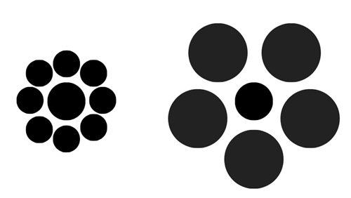 下の図は、エビングハウス錯視といって、同じ大きさの円が、周囲の円の大きさによって異なって見える現象です。周囲の円が小さいと大きく、大きいと小さく見えます。