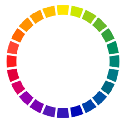 混合した色を順に円状に並べると、下図のようなカラーサークル(色相環)ができます。