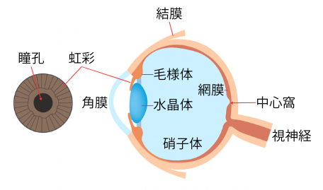 瞳孔の大きさを調整する筋肉をもつ有色部分。目の色(茶色、青色など)は虹彩の色。