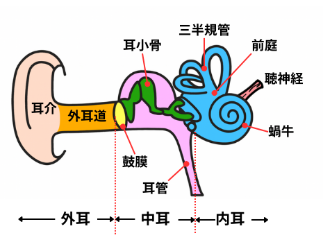 鼓膜、鼓室(空洞)、耳小骨(3つの小さな骨)、耳管(じかん)から構成されます。鼓膜で受けた音の振動を耳小骨で増幅し、内耳に伝えます。